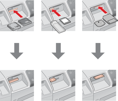 Insira o cartão de memória da forma indicada anteriormente; caso contrário, poderá danificar a impressora ou o cartão de memória (ou ambos). Se inserir um cartão da forma incorrecta, é apresentada uma mensagem de erro no ecrã. Clique em Cancelar, retire o cartão de memória e insira-o correctamente.
