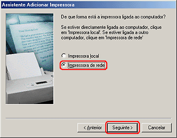 Seleccione Impressora de rede e faça clique em Seguinte.