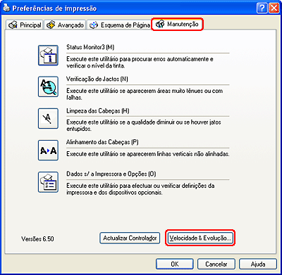 Pode aumentar a velocidade de impressão se seleccionar determinadas definições na janela Velocidade & Evolução. Faça clique na tecla Velocidade & Evolução na janela Manutenção do controlador de impressão’.