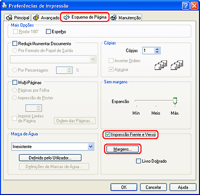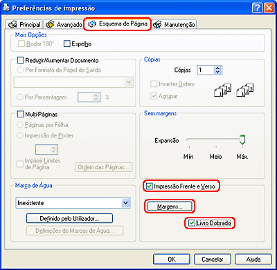Faça clique no separador Esquema de Página e, em seguida, seleccione a caixa de verificação Impressão Frente e Verso.