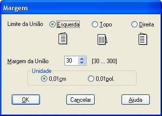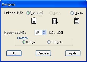 Seleccione a Unidade (cm ou polegadas). Em seguida, especifique a largura da margem de união. Pode definir um valor compreendido entre 0,3 e 3,0 cm ou entre 0,12 e 1,18 polegadas.