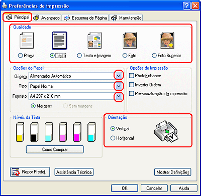 Seleccione Vertical (altura) ou Horizontal (largura) para alterar a orientação da impressão.
