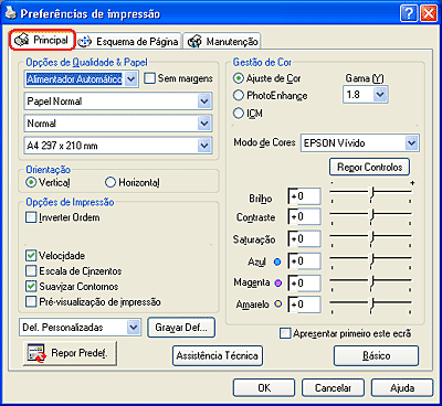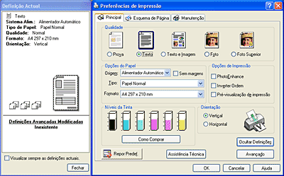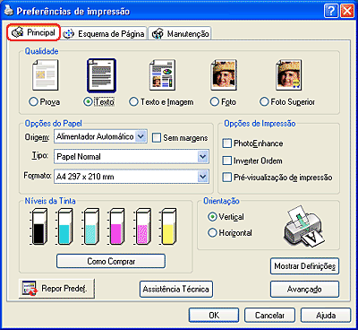 Pode seleccionar a qualidade, opções de papel e opções de impressão, orientação, definições avançadas e ainda verificar os níveis de tinta no menu Principal. Consulte a secção apropriada apresentada em seguida.