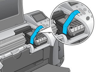 ![]() | Volte a abrir a tampa da impressora. Fixe bem o suporte dos tinteiros à impressora com fita adesiva (conforme indica a figura) e feche a tampa da impressora. |