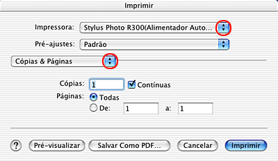 Seleccione Stylus Photo R300 (Alimentador - Sem margens) para a definição de impressão e, em seguida, efectue as definições Cópias & Páginas.