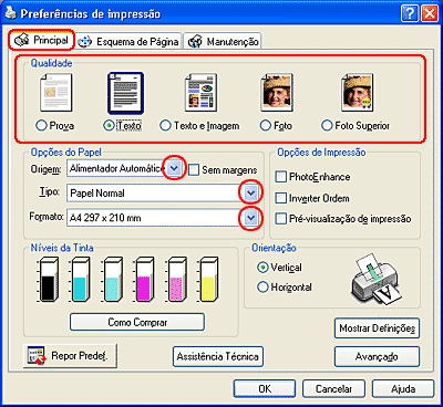 Faça clique no separador Principal e, em seguida, efectue a definição de qualidade. Para mais informações sobre as definições de qualidade, consulte a secção seguinte.