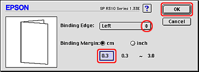 Especifique a largura da margem de união na caixa de texto. Pode definir um valor compreendido entre 0,12 e 1,18 polegadas ou entre 0,3 a 3 cm. Essa largura de margem será utilizada em ambos os lados da dobra. Por exemplo, se especificar um valor de 10 mm, será inserida uma margem de 20 mm (10 mm de cada lado da dobra).