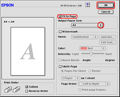 Pode imprimir com a funçãoAjustar à Página, quando pretender imprimir, por exemplo, um documento de formato A4 em papel de outro formato.