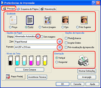 Seleccione Vertical (altura) ou Horizontal (largura) para alterar a orientação da impressão.