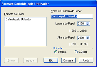 Para apagar um formato de papel personalizado da lista, abra a caixa de diálogo relativa ao formato de papel personalizado e seleccione o nome do formato personalizado que pretende apagar. Em seguida, faça clique em Apagar.