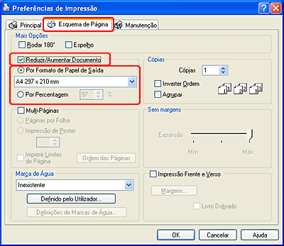 Faça clique no separador Esquema de Página e, em seguida, seleccione a caixa de verificação Reduzir/Aumentar Documento. Pode seleccionar as definições apresentadas em seguida para alterar o formato do documento.