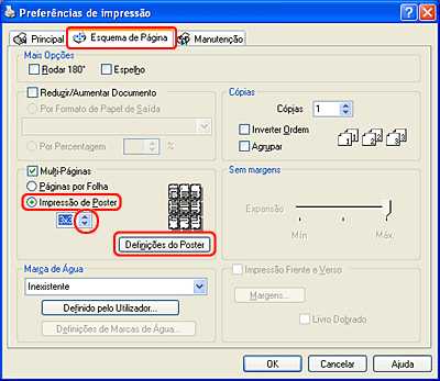 Faça clique no separador Esquema de Página, seleccione Multi-Páginas e, em seguida, seleccione Impressão de Poster. Faça clique na seta para cima ou para baixo para seleccionar 2x2, 3x3 ou 4x4.