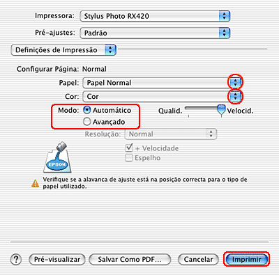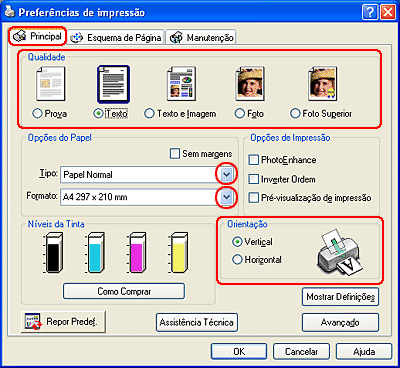 Efectue as definições Papel, Tinta e Modo adequadas. Para mais informações sobre as Definições de Impressão, consulte a ajuda interactiva.