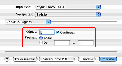 Efectue a definição Impressora de forma a corresponder à definição Impressora efectuada na caixa de diálogo Configurar Página no ponto 3. Em seguida, efectue as definições Cópias & Páginas.