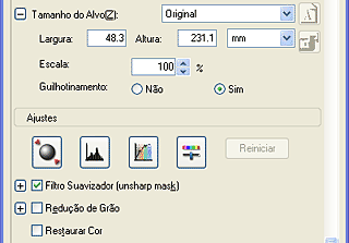 Especifique o tamanho de impressão da imagem digitalizada na opção de tamanho do alvo e efectue ajustes utilizando as ferramentas de ajuste da qualidade de imagem, se necessário.