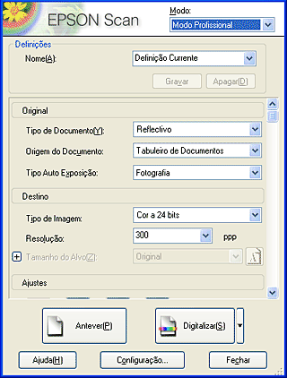 Inicie o EPSON Scan e, em seguida, seleccione o modo profissional. Para obter mais informações sobre como seleccionar o modo de digitalização, consulte Alterar o Modo de Digitalização.