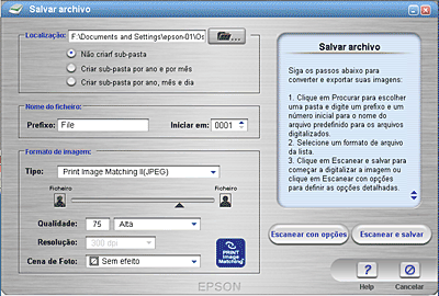 Defina a Localização, o Nome do Ficheiro e o Formato da Imagem. Seleccione Print Image Matching II (JPEG) ou Print Image Matching II (TIFF) na lista Tipo e altere a definição Cenário Foto, se necessário.