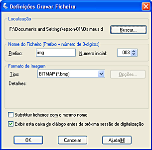 ![]() | Especifique o local onde pretende guardar as imagens digitalizadas. Se pretender alterar a localização predefinida, faça clique na tecla de pesquisa (Windows) ou na tecla de selecção (Macintosh) e seleccione a pasta pretendida. |