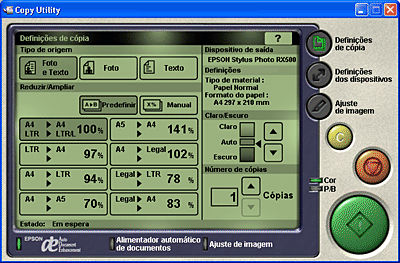 Utilize esta aplicação para transformar o seu produto numa fotocopiadora digital. A aplicação assemelha-se a uma fotocopiadora; no entanto, as suas funções são mais eficazes e flexíveis do que as fotocopiadoras convencionais. Quando inicia esta aplicação, aparece o ecrã apresentado em seguida.