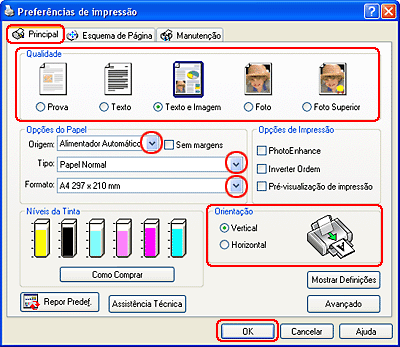 Seleccione as definições de Papel, Cor e Modo adequadas. Para mais informações sobre as Definições de Impressão, consulte a ajuda interactiva.