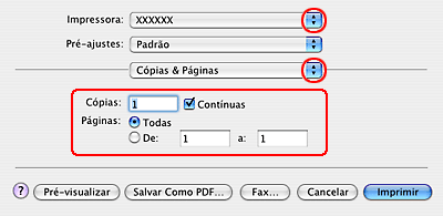 Na definição Impressora seleccione a impressora que está a utilizar. Em seguida, efectue as definições de Cópias e Páginas.