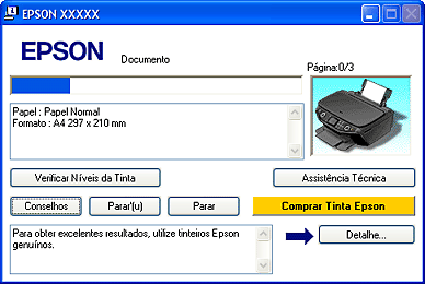 ConselhosNa caixa de texto da janela do medidor de evolução, aparecem sugestões para tirar o máximo partido do controlador de impressão Epson. Aparece uma nova sugestão de 15 em 15 segundos. Para obter mais informações sobre a sugestão indicada na janela, faça clique na tecla Detalhe.