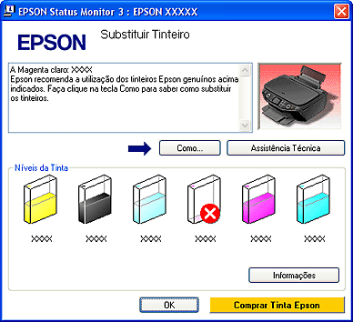 Quando houver pouca tinta ou a tinta acabar, aparece uma tecla Como. Faça clique em Como; o EPSON Status Monitor 3 guiá-lo-á passo a passo no processo de substituição dos tinteiros.