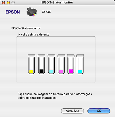 ![]() Pode também executar este utilitário para verificar o estado dos tinteiros antes de imprimir. O EPSON StatusMonitor apresenta o estado dos tinteiros na altura em que foi aberto. Para actualizar o estado dos tinteiros, faça clique em Actualizar.