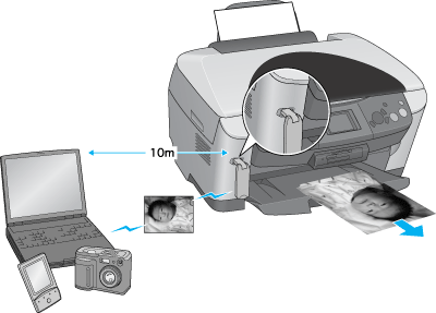 O adaptador de impressão fotográfica Bluetooth opcional constitui um módulo de comunicação sem fios utilizado para imprimir a partir de câmaras digitais e outros dispositivos equipados com a tecnologia sem fios Bluetooth e não necessita de cabos quando ligado a este produto.