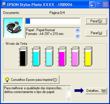 Na parte inferior da janela do medidor de evolução aparecem sugestões para tirar o máximo partido do software da impressora Epson. Aparece uma nova sugestão de 30 em 30 segundos. Para obter mais informações sobre a sugestão que aparece na janela, faça clique na tecla Detalhes.