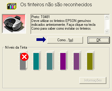 Quando a tinta acabar ou houver pouca tinta, aparecerá a tecla Como. Faça clique em Como para que o EPSON StatusMonitor o oriente no processo de substituição dos tinteiros.