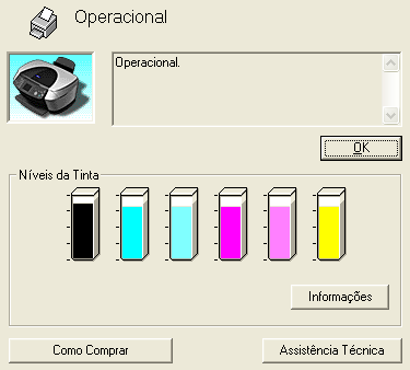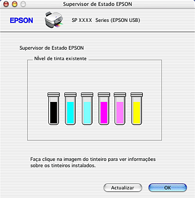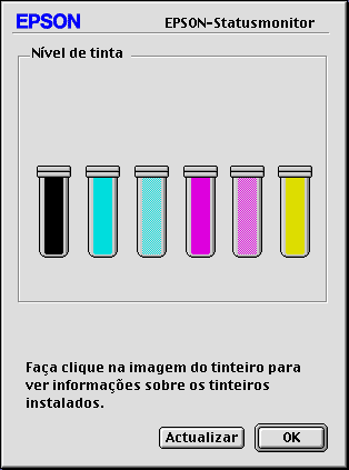 Este utilitário permite também verificar os níveis de tinta antes da impressão. O EPSON StatusMonitor apresenta a quantidade de tinta existente na altura em que foi aberto. Para actualizar as informações relativas ao nível de tinta, faça clique em Actualizar.