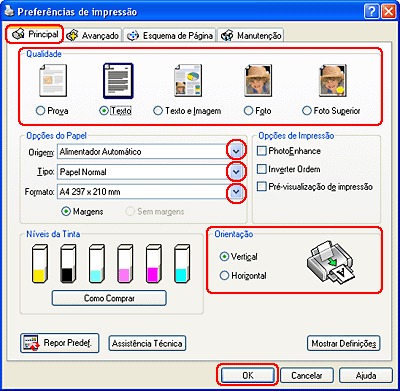 Seleccione as definições adequadas para Papel, Cor e Modo. Para mais informações sobre Definições de Impressão, consulte a ajuda interactiva.