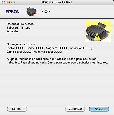 Quando houver pouca tinta ou a tinta acabar, aparece uma tecla Como. Faça clique em Como; o EPSON Status Monitor 3 guiá-lo-á passo a passo no processo de substituição dos tinteiros.