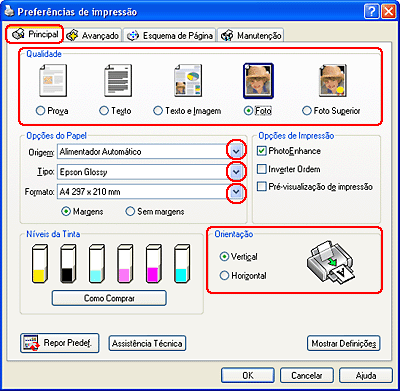 Seleccione Vertical (altura) ou Horizontal (largura) para alterar a orientação da impressão.