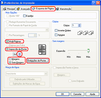 Faça clique em Definições do Poster para ajustar a forma como o poster será impresso. Abre a janela Definições do Poster.