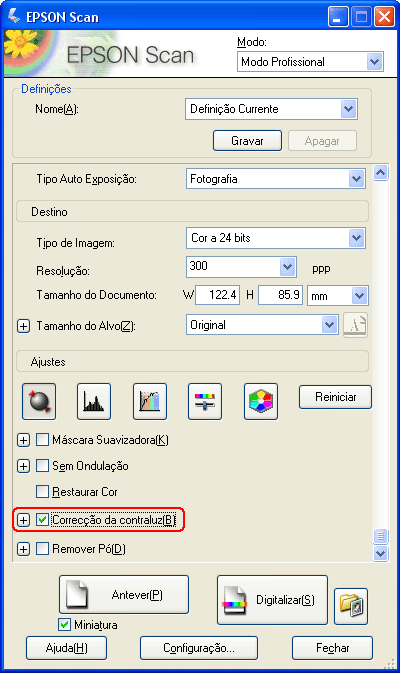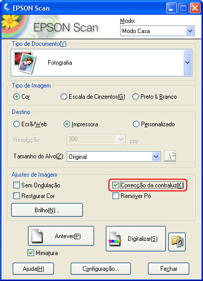 Execute as operações que se seguem para corrigir fotografias com contraluz utilizando o Epson Scan.