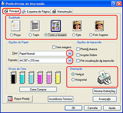 Efectue as definições Papel, Tinta e Modo adequadas. Para obter mais informações sobre as definições de impressão, consulte a ajuda interactiva.