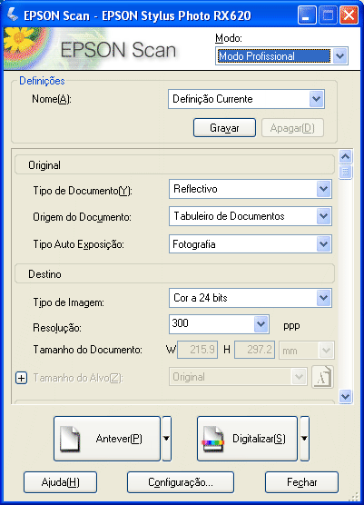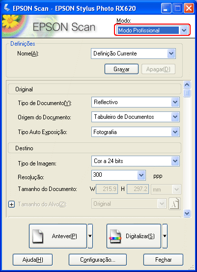 Para efectuar as definições adequadas para a digitalização de documentos e fotografias (documentos reflexivos) no modo profissional, execute as seguintes operações: