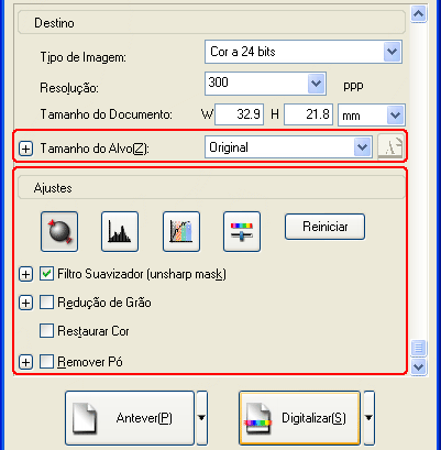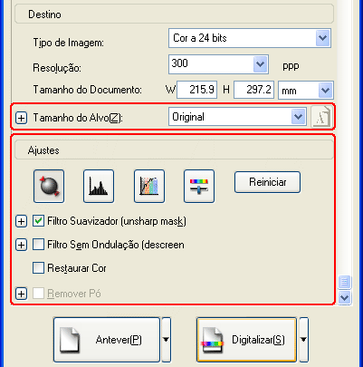 ![]() | Utilize a definição de tamanho do alvo para especificar o tamanho de saída da imagem digitalizada. Especifique também as definições de ajuste, se necessário. Para mais informações, consulte Criar Reproduções de Qualidade. |