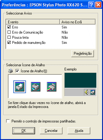 Seleccione a caixa de verificação Ícone de Atalho e escolha o tipo de ícone que pretende colocar na barra de tarefas do Windows. Pode fazer clique no ícone de atalho na barra de tarefas para abrir o EPSON Status Monitor 3 ou fazer clique com a tecla direita do rato no ícone para aceder a alguns utilitários da impressora. |
