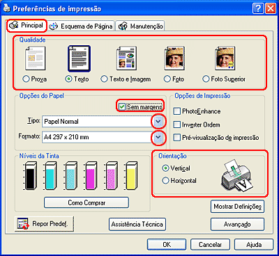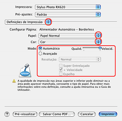 Efectue as definições Papel, Tinta e Modo adequadas. Para obter mais informações sobre as definições de impressão, consulte a ajuda interactiva.