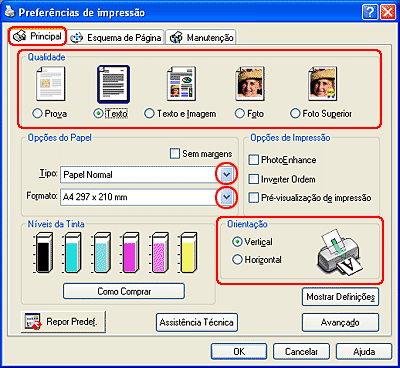 Faça clique no separador Principal e, em seguida, efectue a definição Opção de Qualidade. Para obter informações, consulte a ajuda interactiva.