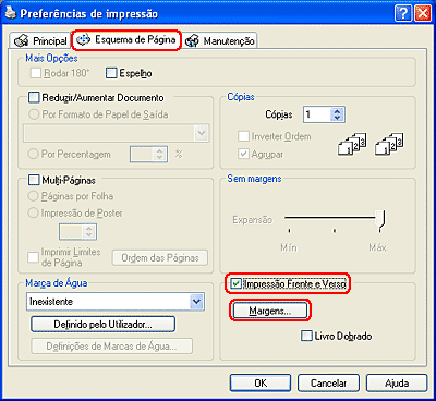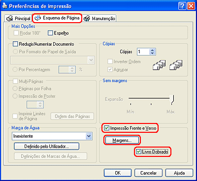 Faça clique no separador Esquema de Página e, em seguida, seleccione a caixa de verificação Impressão frente e verso.