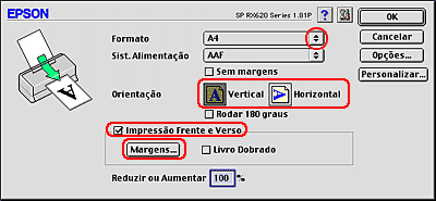 Seleccione Vertical (altura) ou Horizontal (largura) para alterar a orientação da impressão.