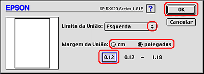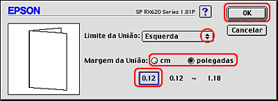 Seleccione a unidade de medida cm ou polegadas. Especifique a largura da margem de união. Pode definir um valor compreendido entre 0,3 e 3 cm ou entre 0,12 e 1,18 polegadas. Essa largura de margem será utilizada em ambos os lados da dobra. Por exemplo, se especificar um valor de 1 cm, será inserida uma margem de 2 cm (1 cm de cada lado da dobra).