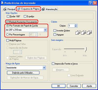 Faça clique no separador Esquema de Página e, em seguida, seleccione a caixa de verificação Reduzir/Aumentar Documento. Pode seleccionar as definições apresentadas em seguida para alterar o formato do documento.