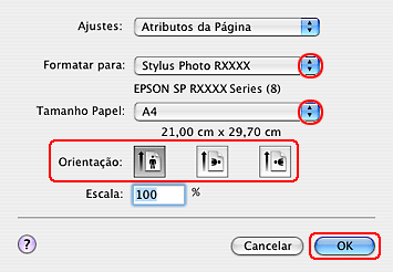 Seleccione A4 297 x 210 mm, Letter 8½ x 11 pol ou B5 182 x 257 mm para a definição Formato.