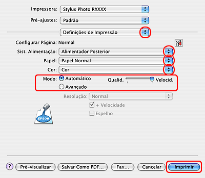 Seleccione Papel Normal para a definição Papel e, em seguida, seleccione as definições adequadas para Cor e Modo. Para mais informações sobre Definições de Impressão, consulte a ajuda interactiva.