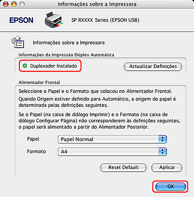 Certifique-se de que aparece Duplexador Instalado na secção Informações da Impressão Dúplex Automática e faça clique em OK.